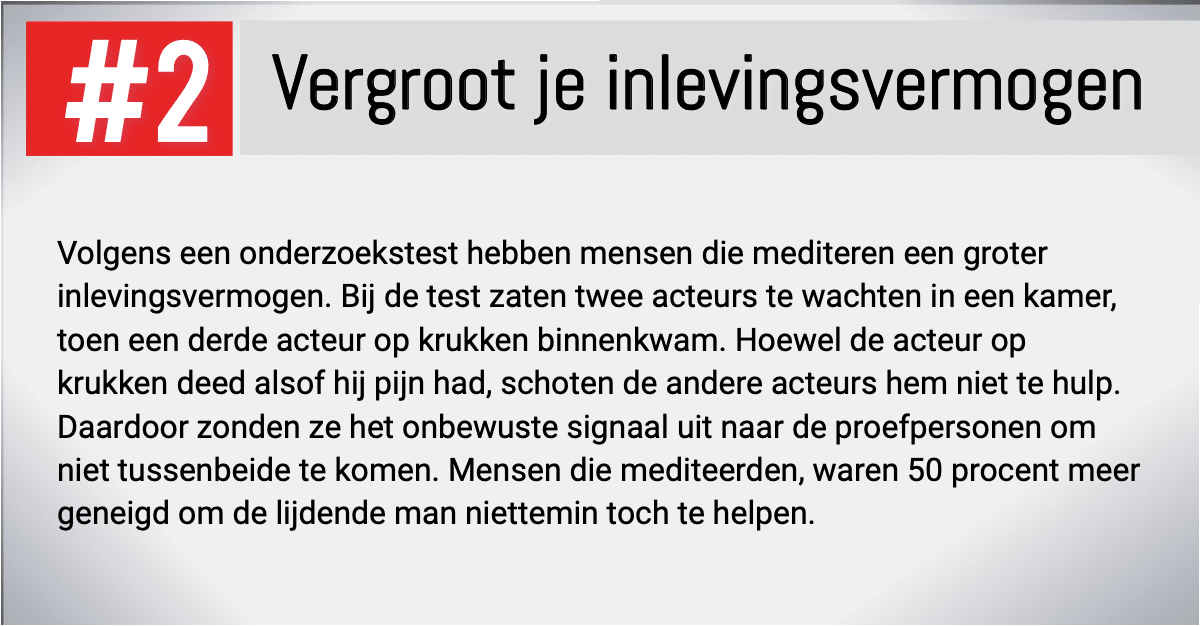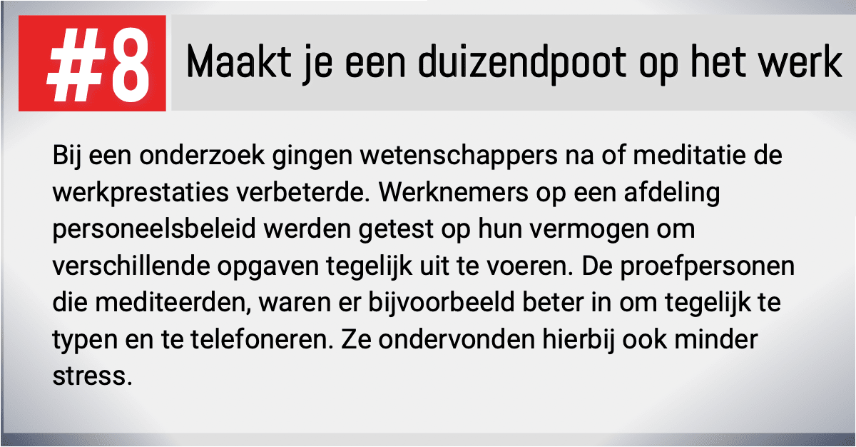 De hoeveelheid positieve voordelen van meditatie voor je fysieke en mentale gezondheid wegen sowieso niet op tegen het 'Ik-heb-geen-tijd'- argument. Door meer rust en stressbestendigheid op te bouwen, ga je veel minder tijd verliezen aan nutteloze stressoren en gaat het lijken alsof je zelfs tijd over hebt!