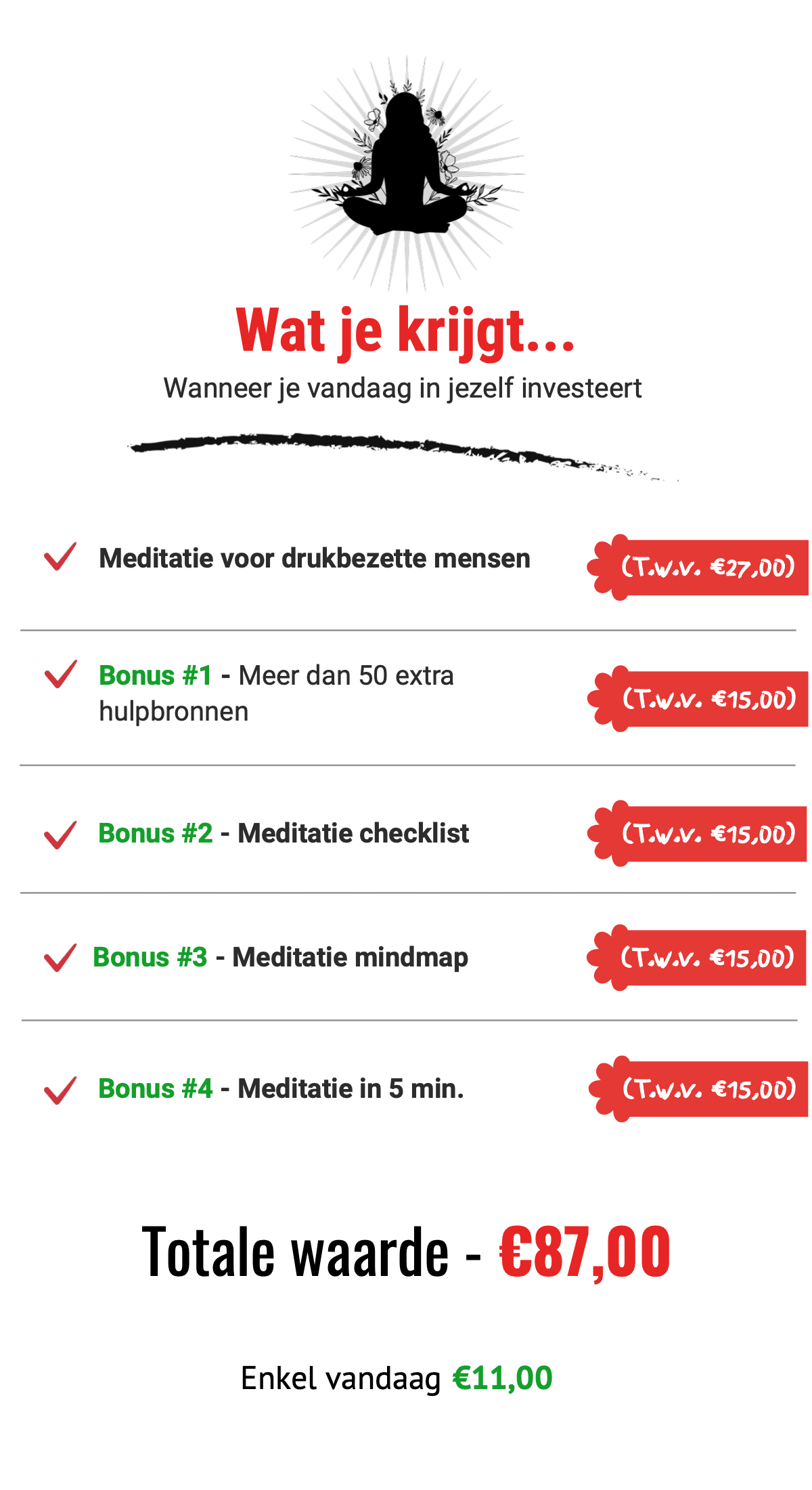 Daarom stelde ik een gids voor je samen, waarin ik je de belangrijkste inzichten geef die je moet weten omtrent meditatie. Ik leer je - zonder teveel poespas - hoe te mediteren en hoe je meditatie kunt integreren in je drukke agenda.